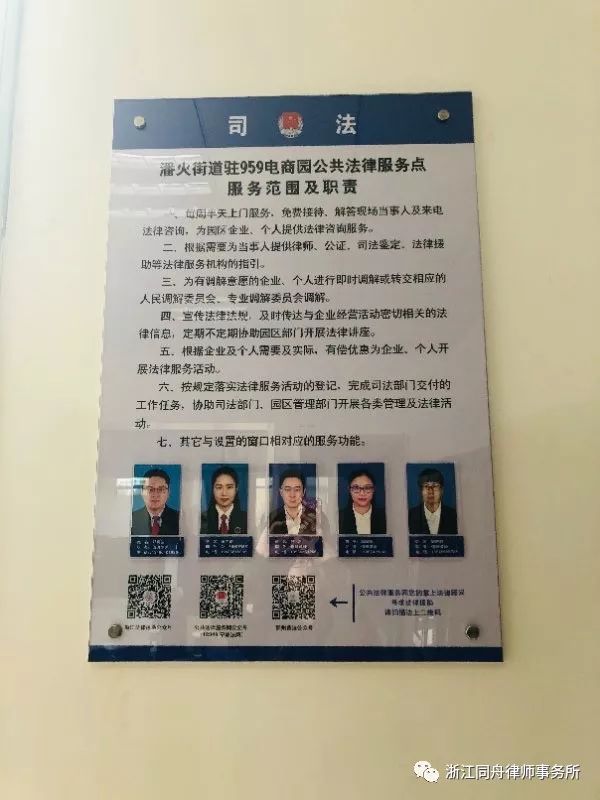 潘火司法所与浙江同舟律师事务所紧密合作,除在街道设立公共法律服务站外,目前已正式建立了“959电商园公共法律服务点”、“中物科技园公共法律服务点”,设置固定的接待中心每周三定期安排专职律师到园区值班、走访,同时开通咨询专线,为园区内企业提供法律咨询服务。